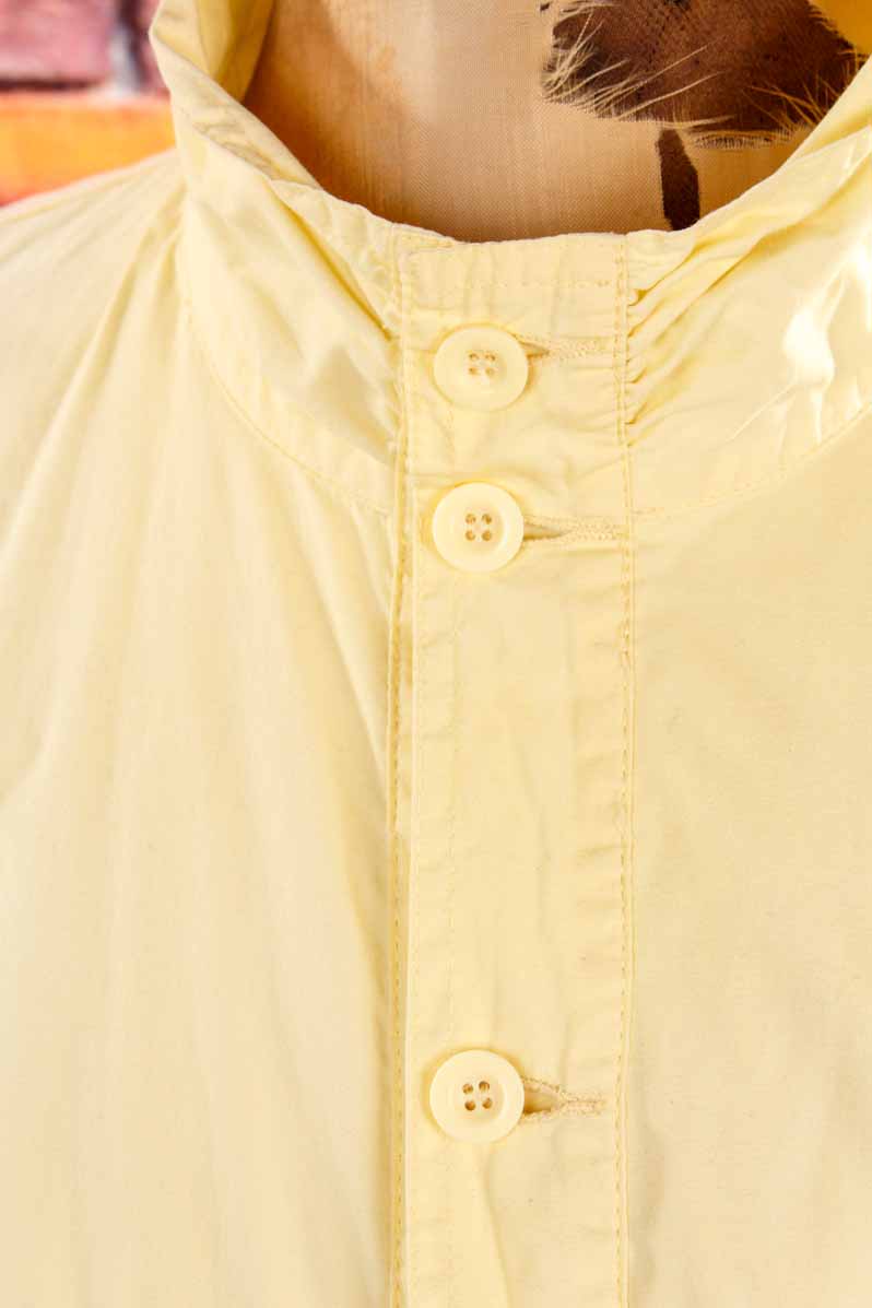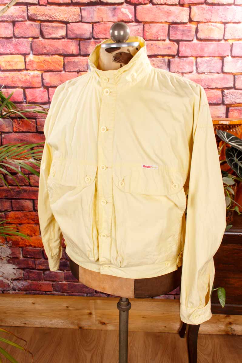hell gelbe Jacke aus Baumwollstoff mit typischem 80er Jahre Stil. Knopfverschluss, Bündchen, Blasebalgtaschen.
