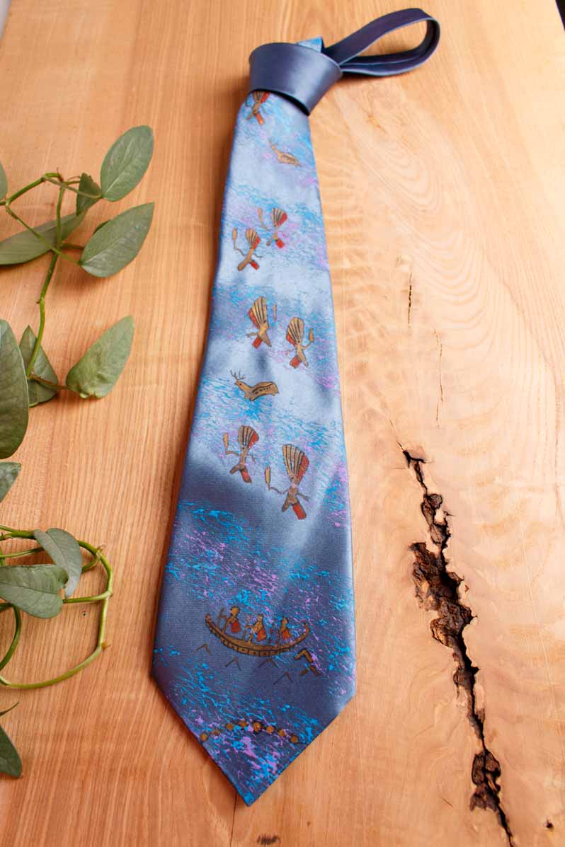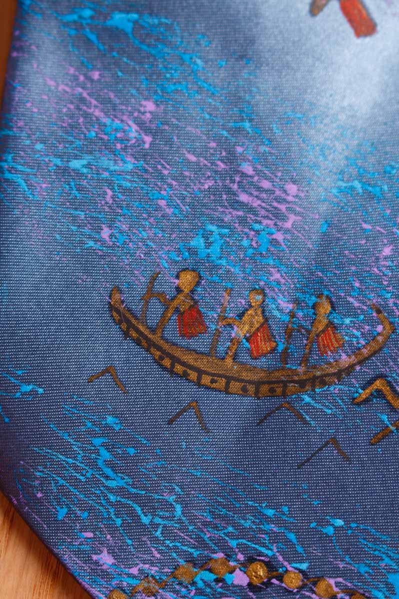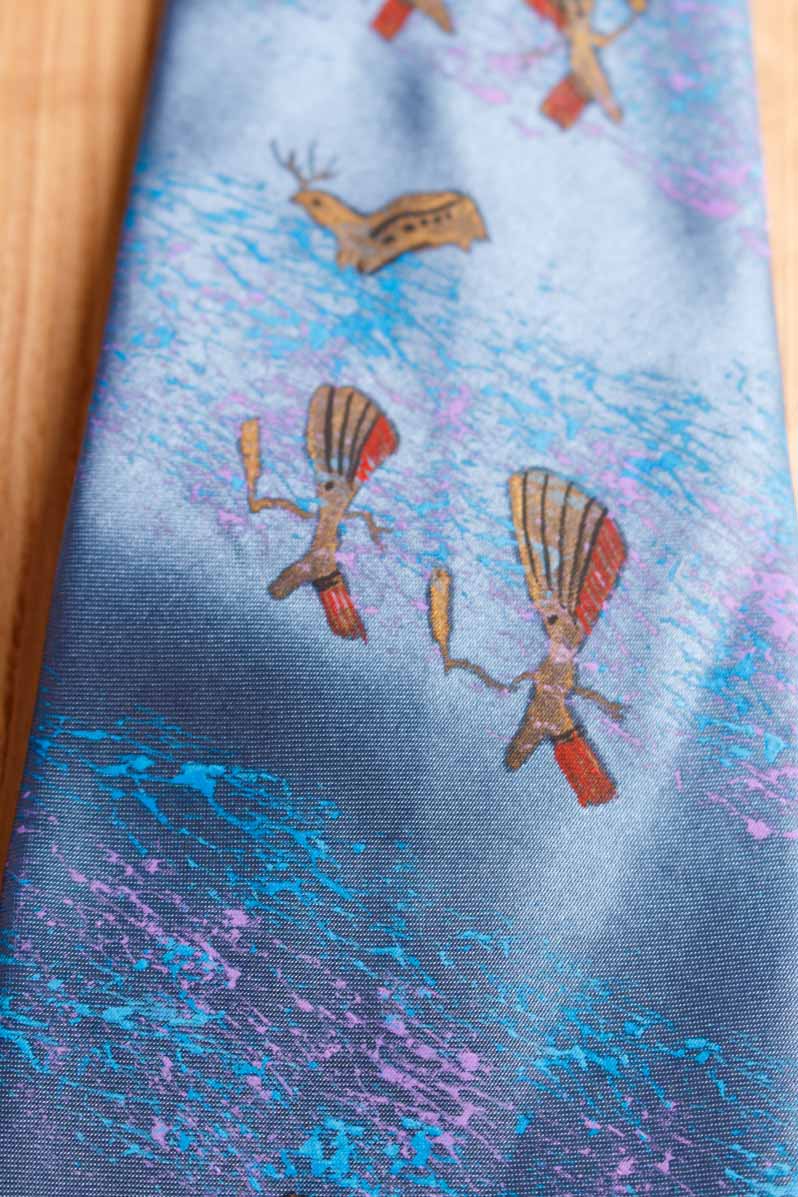 bunt gemusterte Krawatte aus blauem Satin. Achtung, keine echte Seide, wie auf dem Etikett steht!