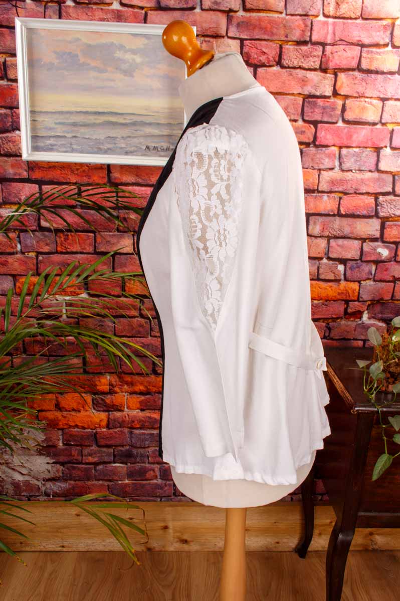 ausgefallene Bluse aus schwarzem und weißem Stoff mit Spitzenärmel und goldener Stickereien