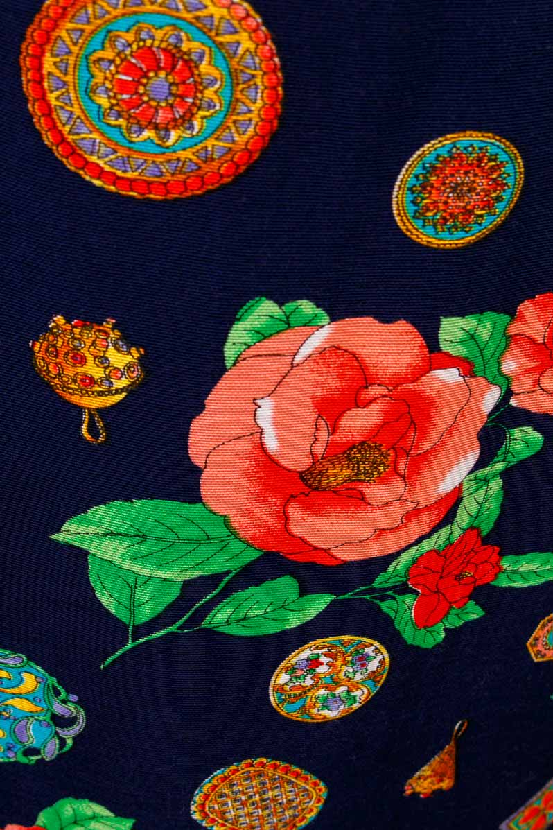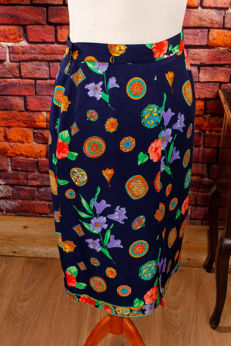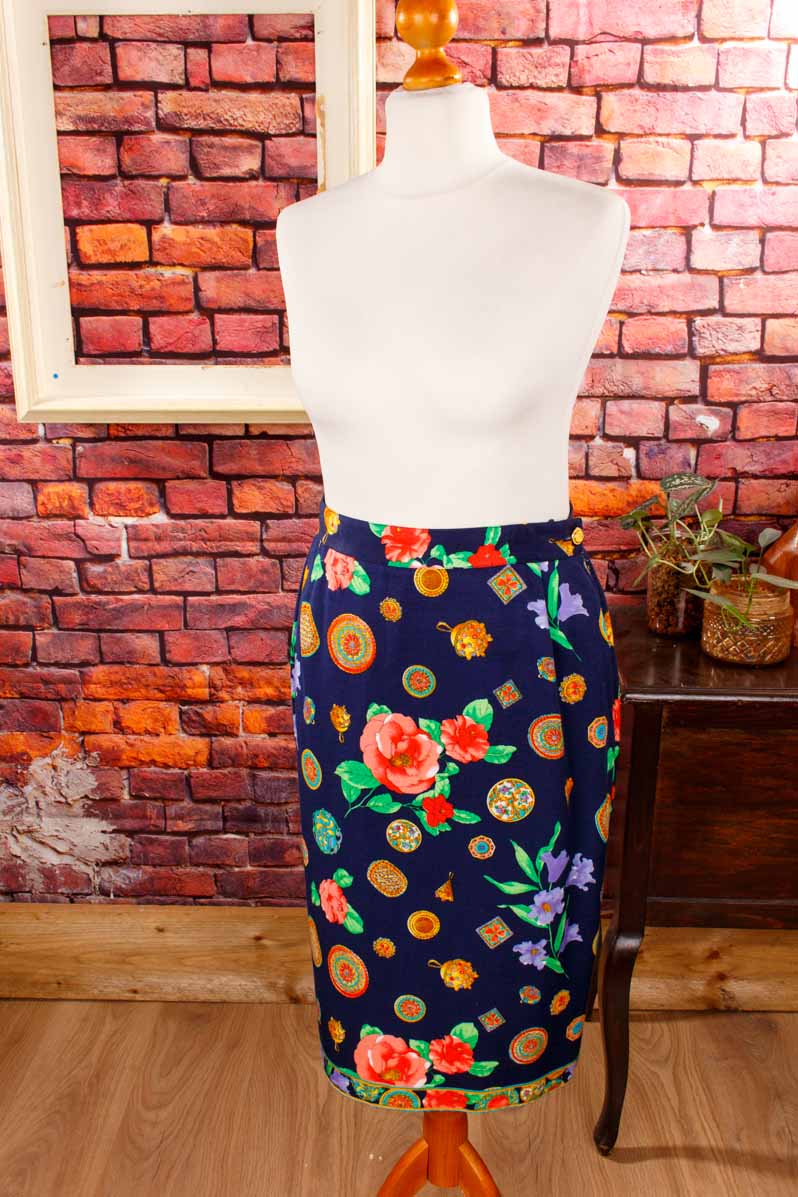 eleganter Rock aus festem, blauem Viskosestoff mit leuchtend buntem Muster