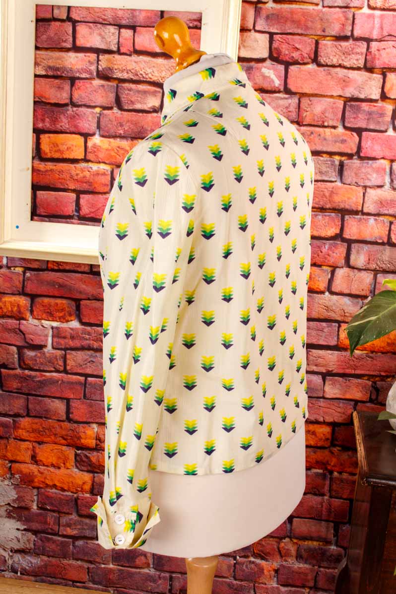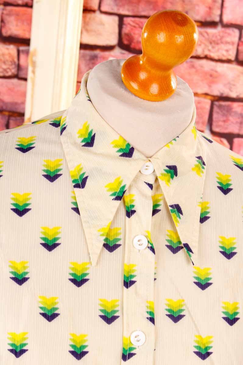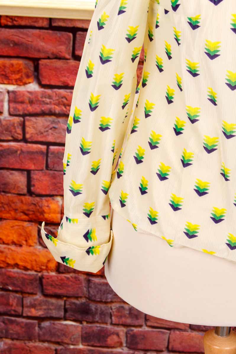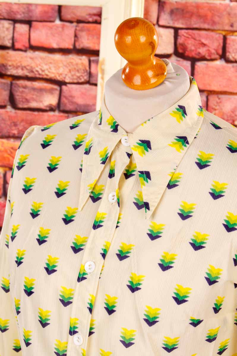 beigefarbene Bluse aus feinem Nylonstoff mit grünem Muster und spitzem Kragen
