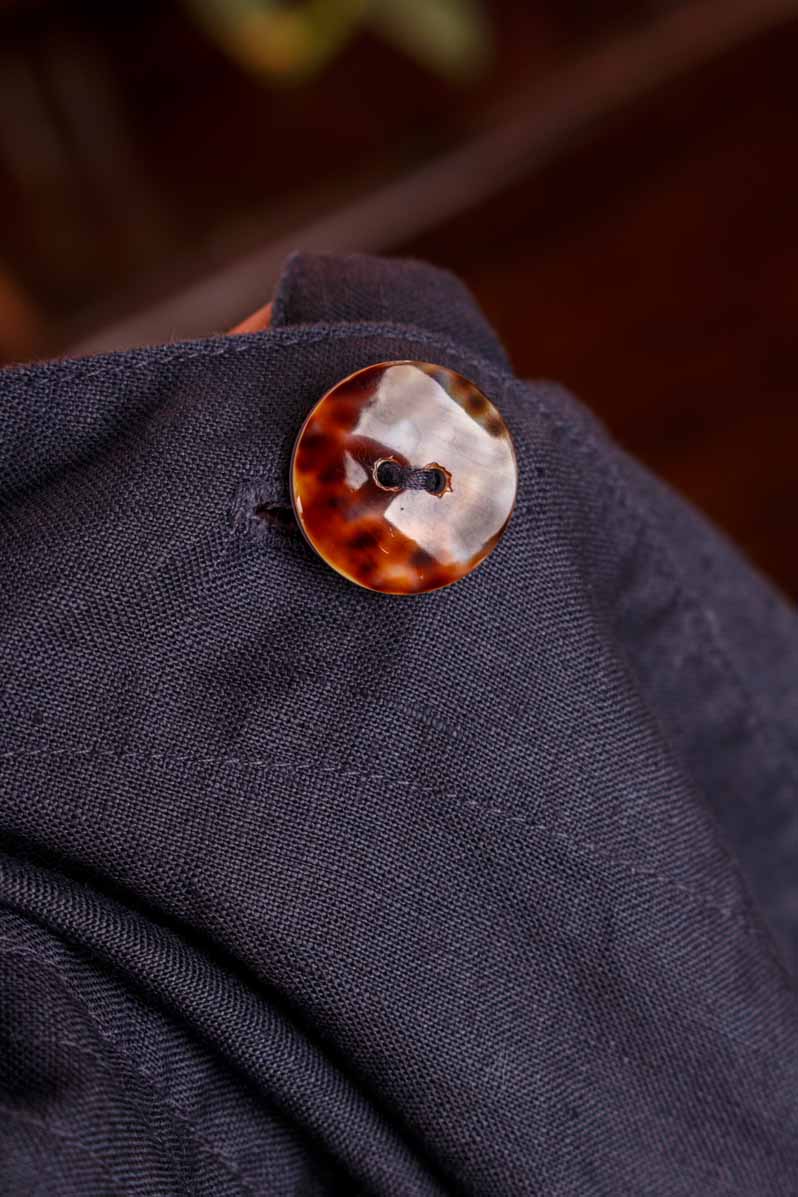 Diese schicke Bluse aus dunkelgrauem Leinenstoff besticht durch feine Flecht-Details und elegante Muschelknöpfe. Der gerade Blazerschnitt mit praktischen Taschen sorgt für einen lässig-verspielten Look, während das ungefütterte Design für angenehme Leichtigkeit steht. Ein schönes Vintage-Stück mit charmantem Charakter!
