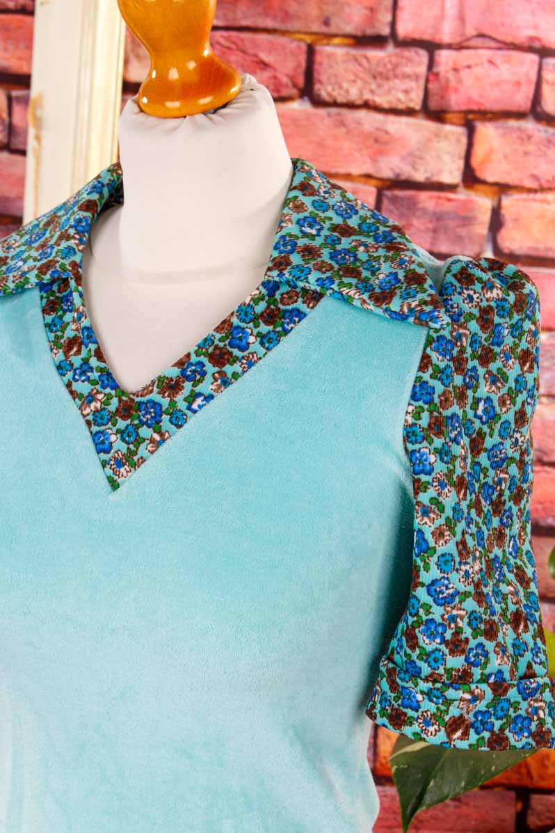 türkisfarbenes Top aus weichem Stretchsamt und Blümchen-Cord