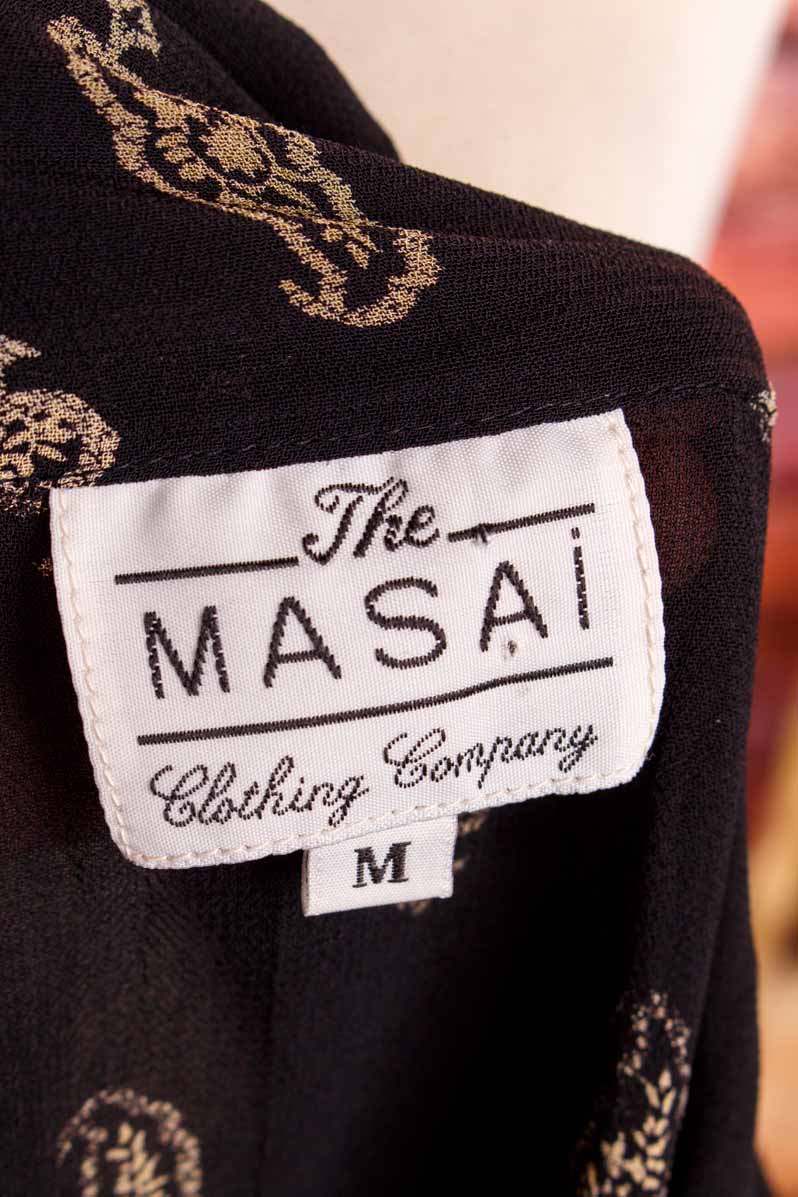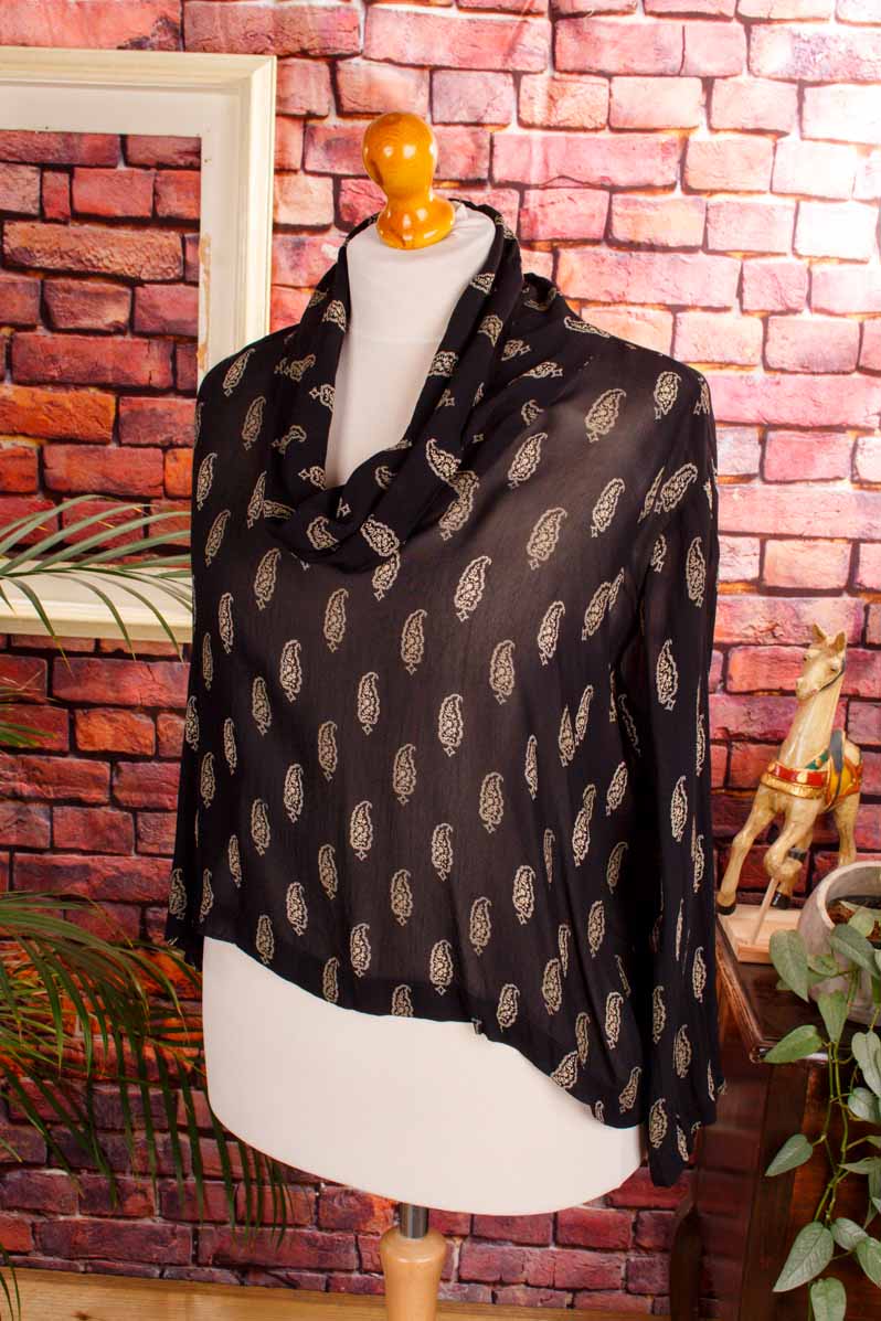 weit geschnittenes Top aus zartem schwarzem Chiffon mit beigefarbenem Paisley-Muster und weitem Rollkragen