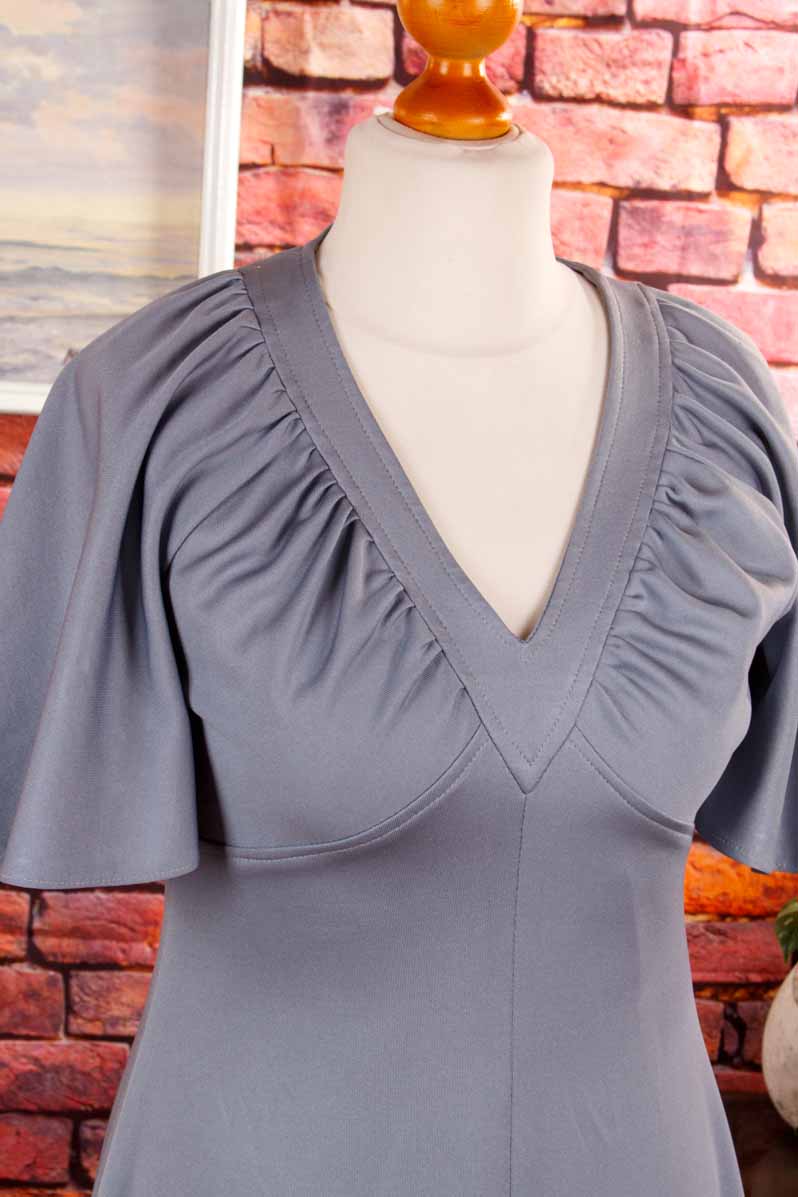 langes Kleid aus silbergrauem Stretchstoff mit Flügelärmel