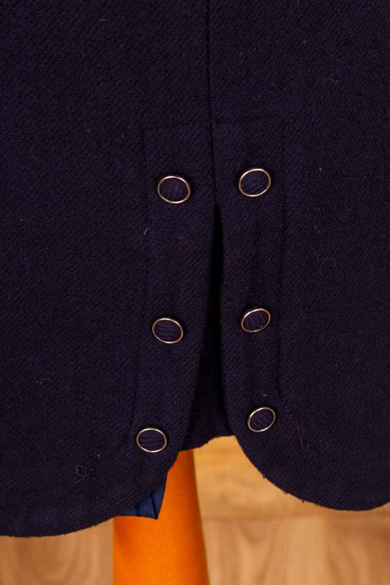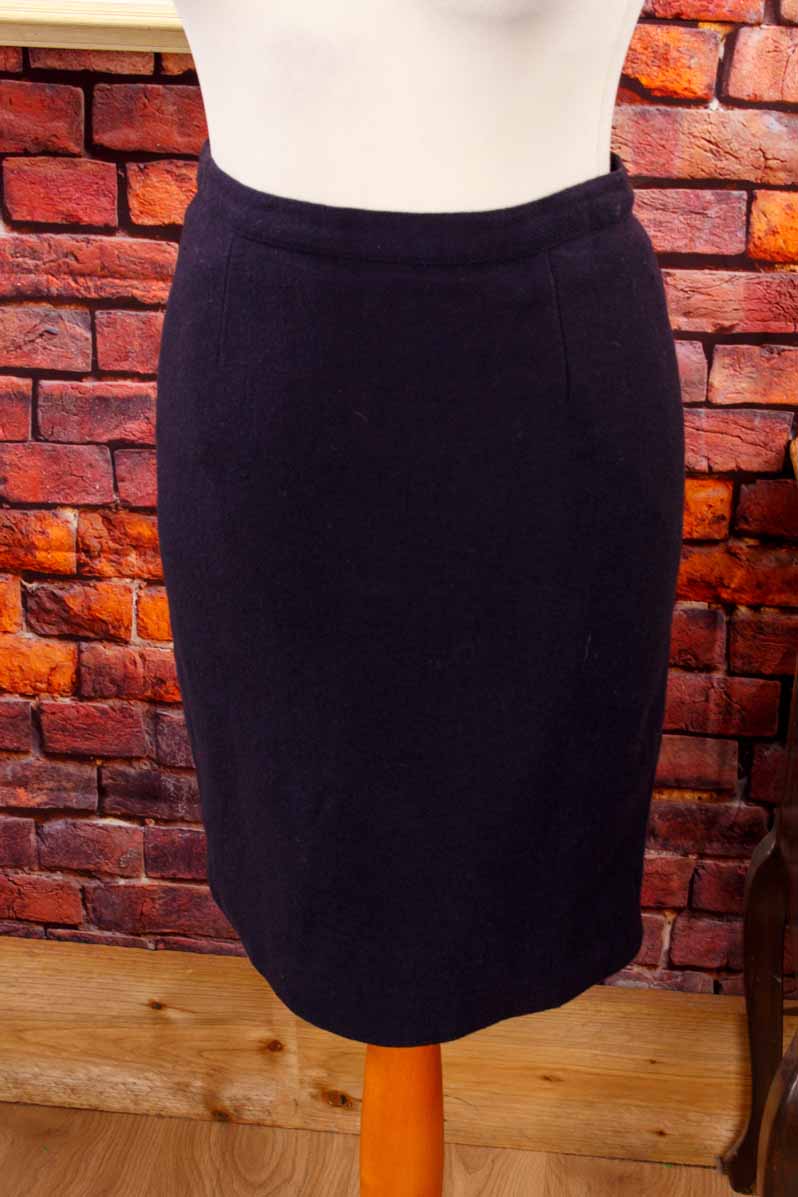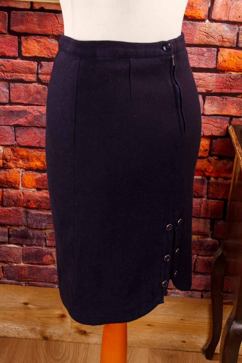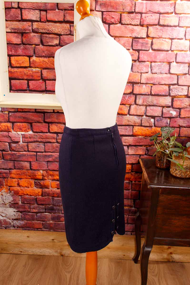 eleganter kurzer Rock aus dickem, dunkelblauem Wollstoff mit extravagantem geknöpftem Gehschlitz hinten