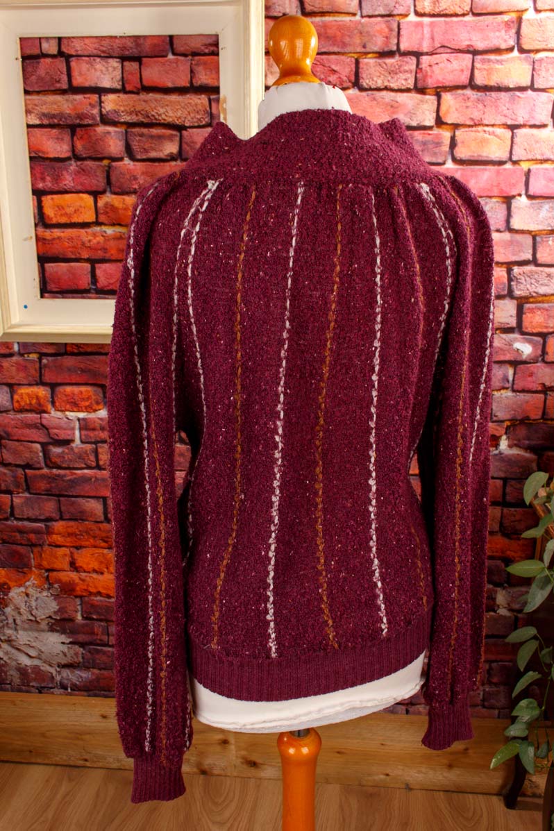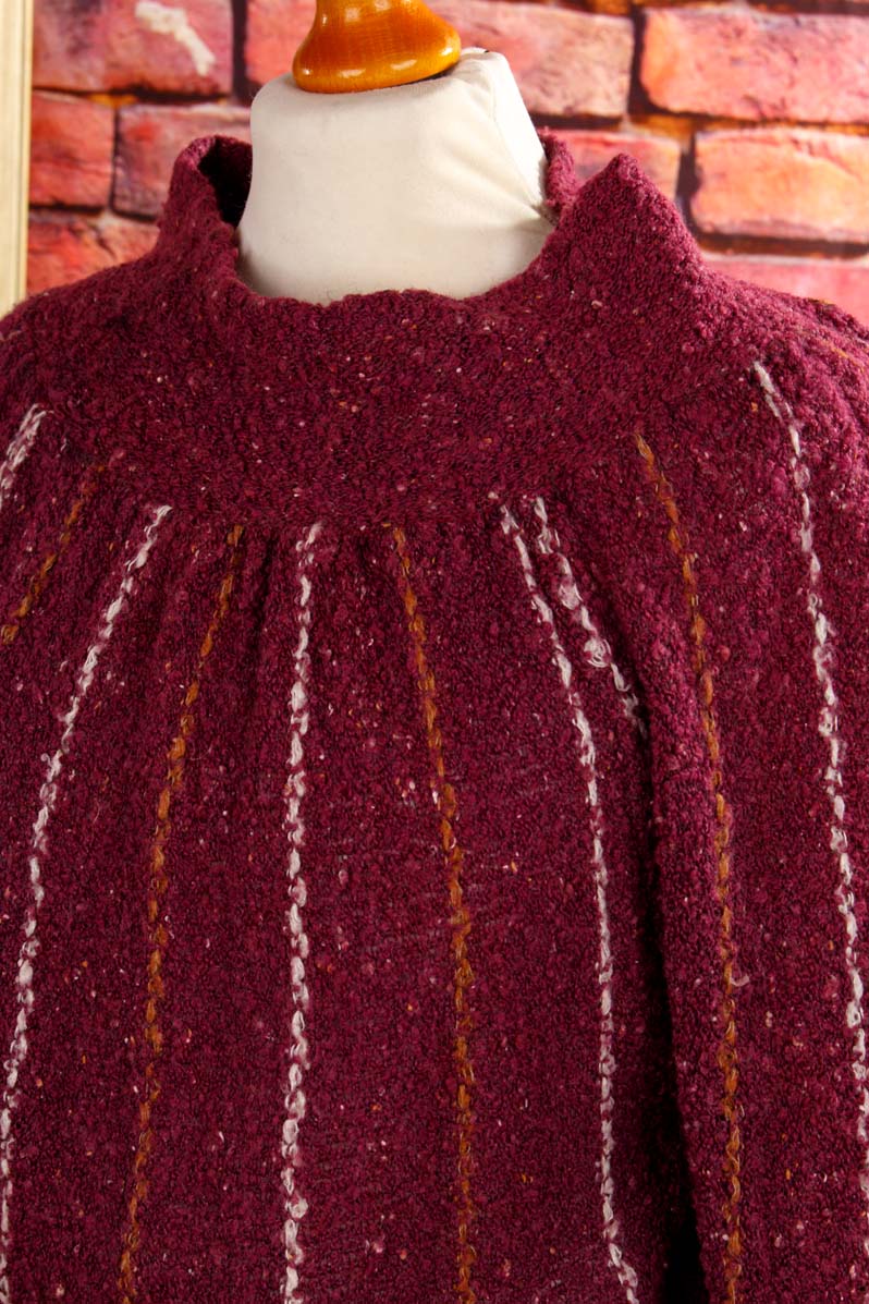 extravaganter, dünner Pulli aus lila Bouclégarn mit Streifenmuster und weitem Kragen