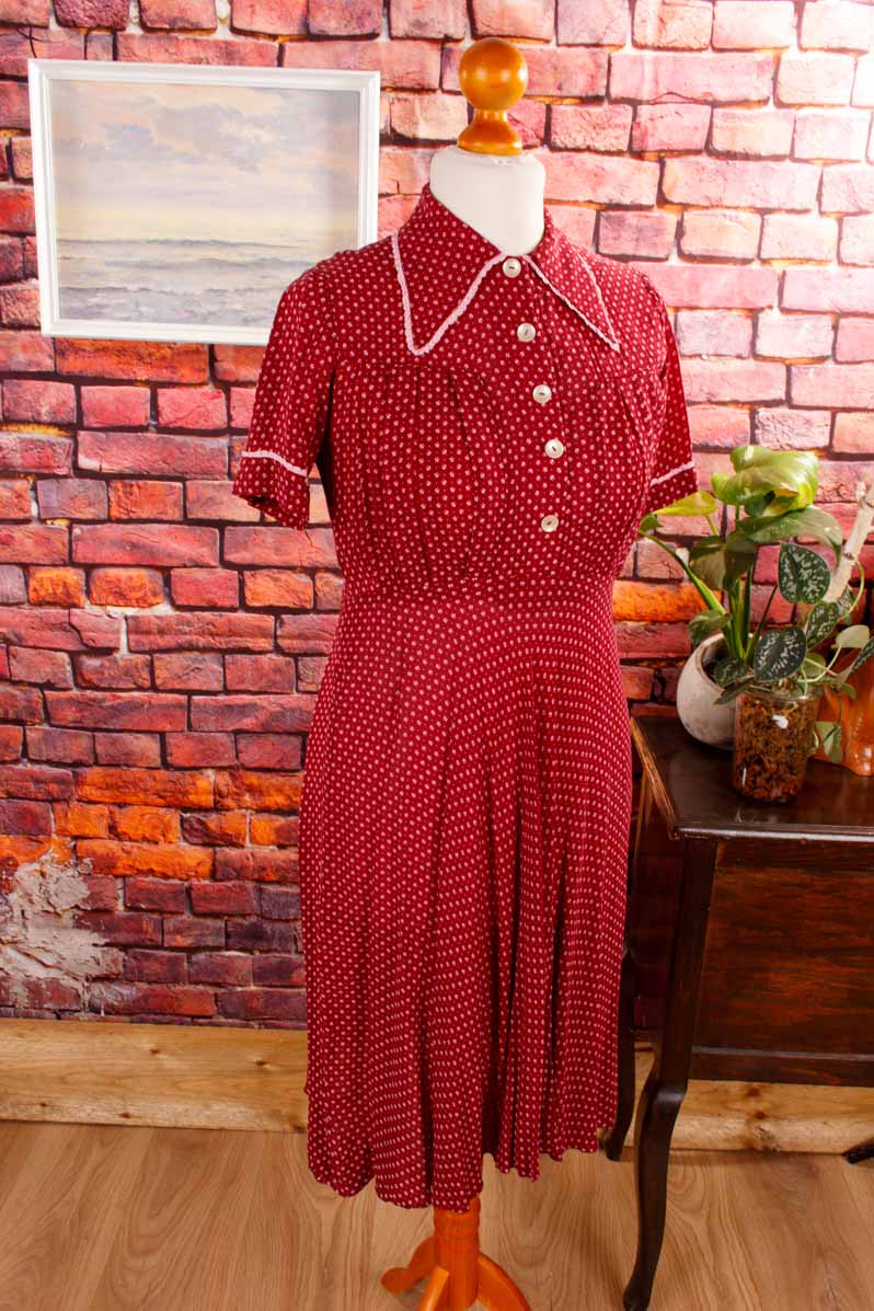 vorn und seitlich mit Druckknöpfen zu schließen. Schwingender Rockteil, ungefüttert, leicht durchsichtig. Original 40er-Jahre!