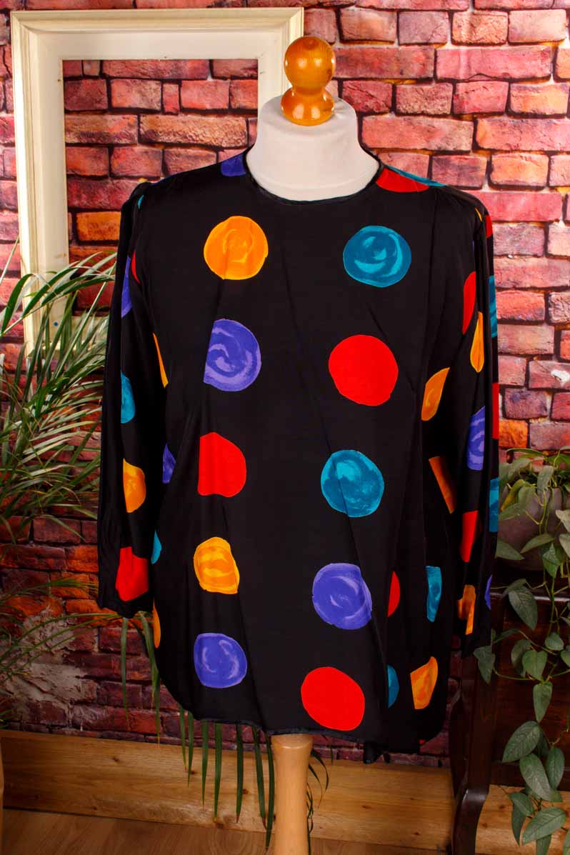 Dieses weit geschnittene Top aus schwarzem Viskosestoff ist ein echter Hingucker dank seines lebhaften, bunten Tupfenmusters. Die asymmetrische Falte an der Schulter sorgt für eine verspielte Silhouette, die jedem Outfit eine besondere Note verleiht. Besonders praktisch ist der Knopfverschluss auf der Rückseite, der das An- und Ausziehen mühelos macht. Ob zu Jeans oder einem Rock – dieses 80er-Jahre-inspirierte Top bringt Farbe und Spaß in deinen Kleiderschrank und fühlt sich dank des leichten Viskosematerials angenehm auf der Haut an. Perfekt für einen fröhlichen, unbeschwerten Look!Original 80er- oder 90er-Jahre!