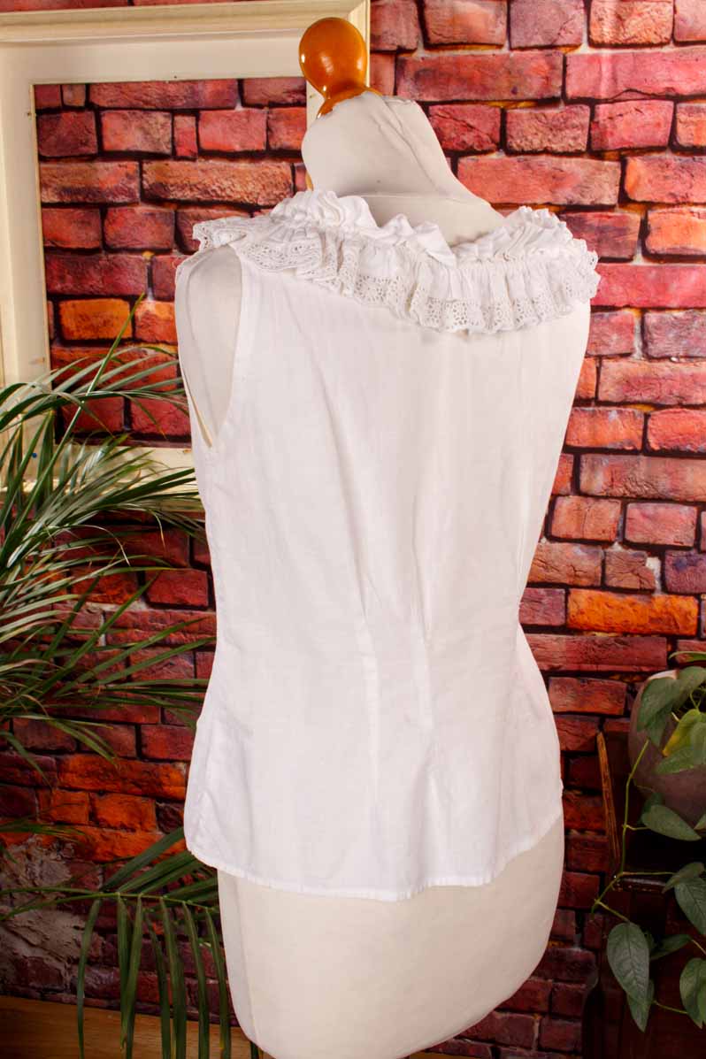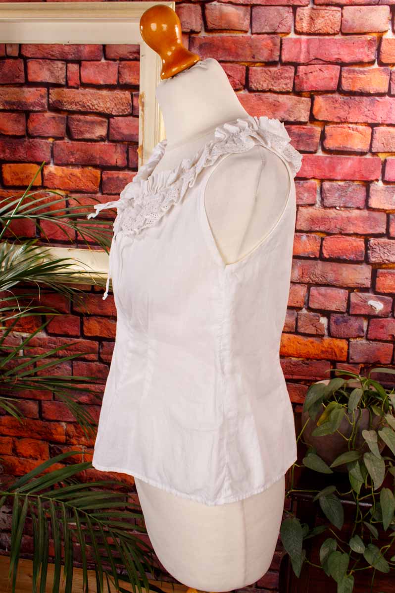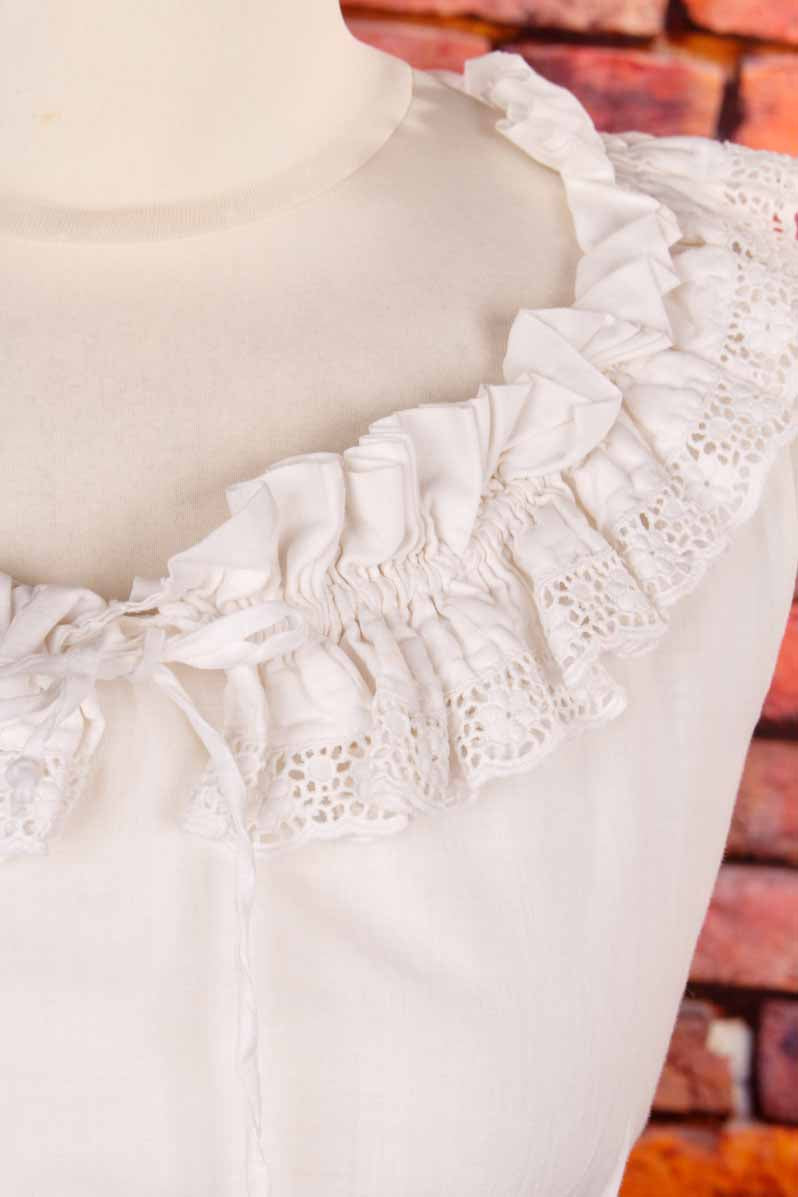 Diese antike weiße Bluse aus weichem Baumwollstoff verzaubert mit einer zarten Spitzenrüsche, die an vergangene Zeiten erinnert. Leicht tailliert, um deine Silhouette charmant zu umspielen, lässt sie sich ganz unkompliziert über den Kopf ziehen, ganz ohne knifflige Verschlüsse. Ob zu einem nostalgischen Vintage-Look oder als verspieltes Highlight in deinem Alltag – diese Bluse bringt einen Hauch Romantik und Leichtigkeit in jedes Outfit. Perfekt, um Eleganz und Komfort spielerisch zu verbinden! vermutlich aus den 60er Jahren, oder älter