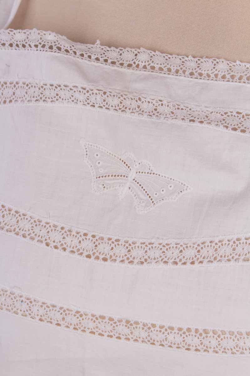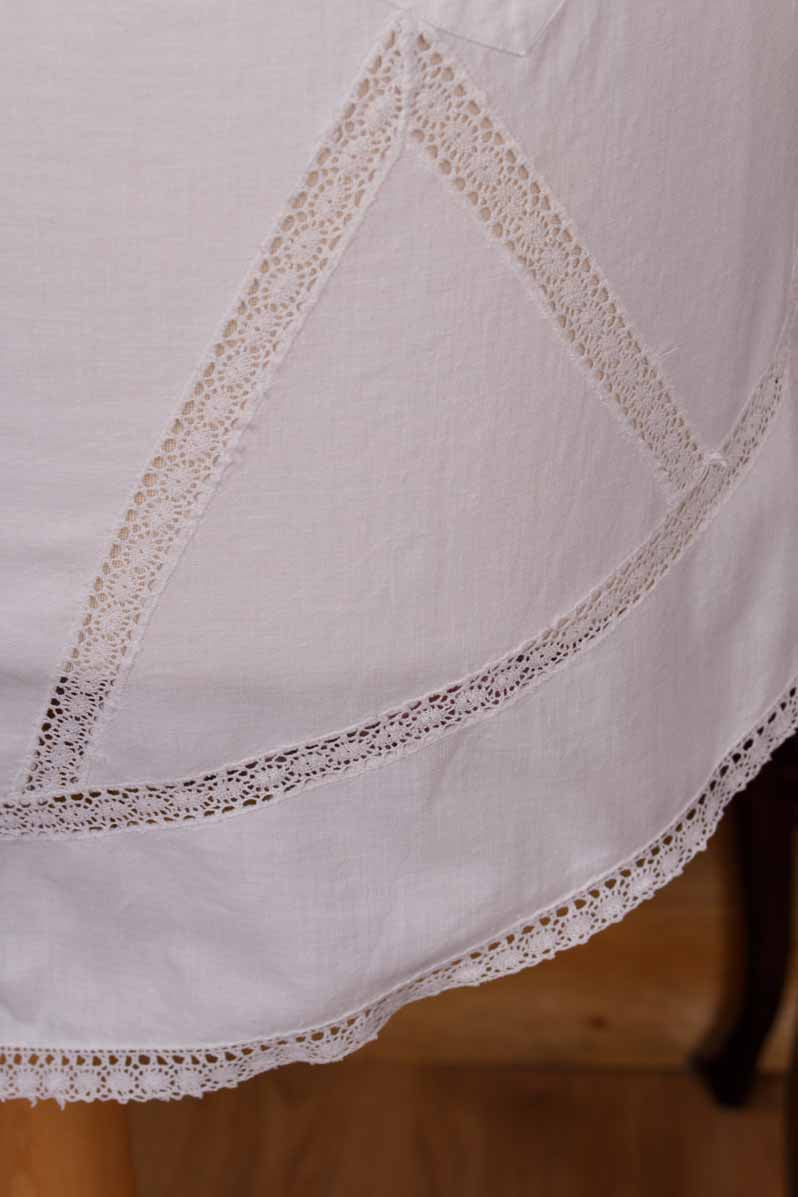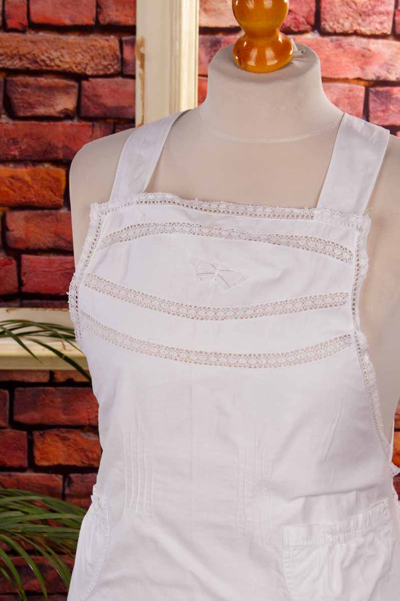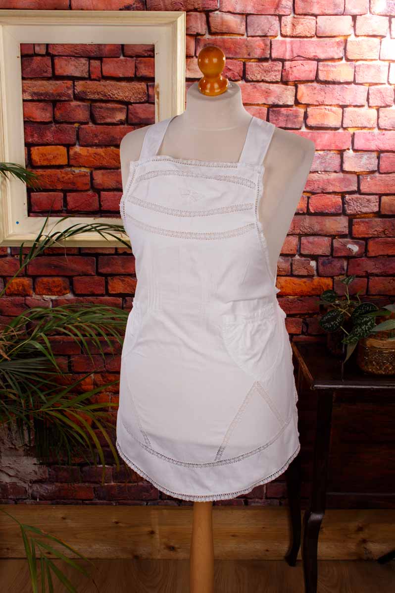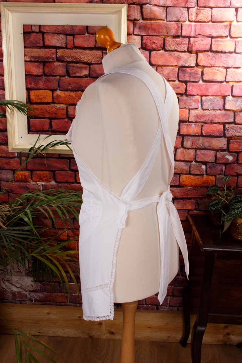 reinweiße Schürze in klassischem schnitt mit Bindebändern, kleinen Taschen und Spitzenborte