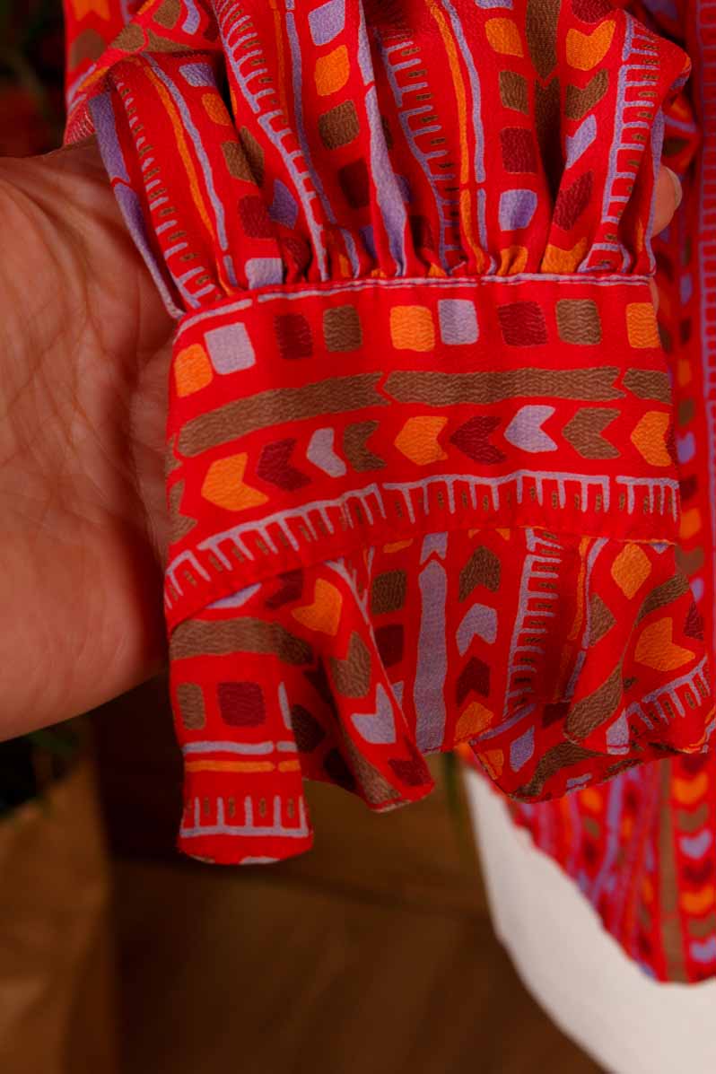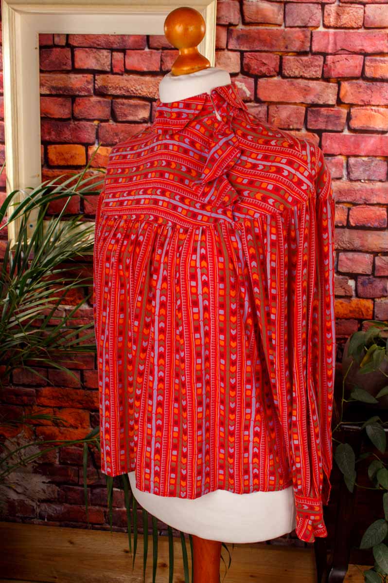 Diese extravagante Seidenbluse in einem lebhaften Rot mit buntem Muster fällt sofort ins Auge und bringt Schwung in jeden Look. Der asymmetrische Stehkragen mit seitlichem Knopfverschluss setzt ein modisches Statement, während die verspielte Rüsche einen charmanten Akzent setzt. Ab der Brust fällt die Bluse weit und luftig, sorgt für höchsten Tragekomfort und lässt sich toll zu eng geschnittenen Hosen oder Röcken kombinieren. Der kurze Schnitt macht sie perfekt für stylische Layering-Looks oder solo getragen ein echter Hingucker – eine Bluse, die Spaß macht und Eleganz verbindet! Original 80er-Jahre!