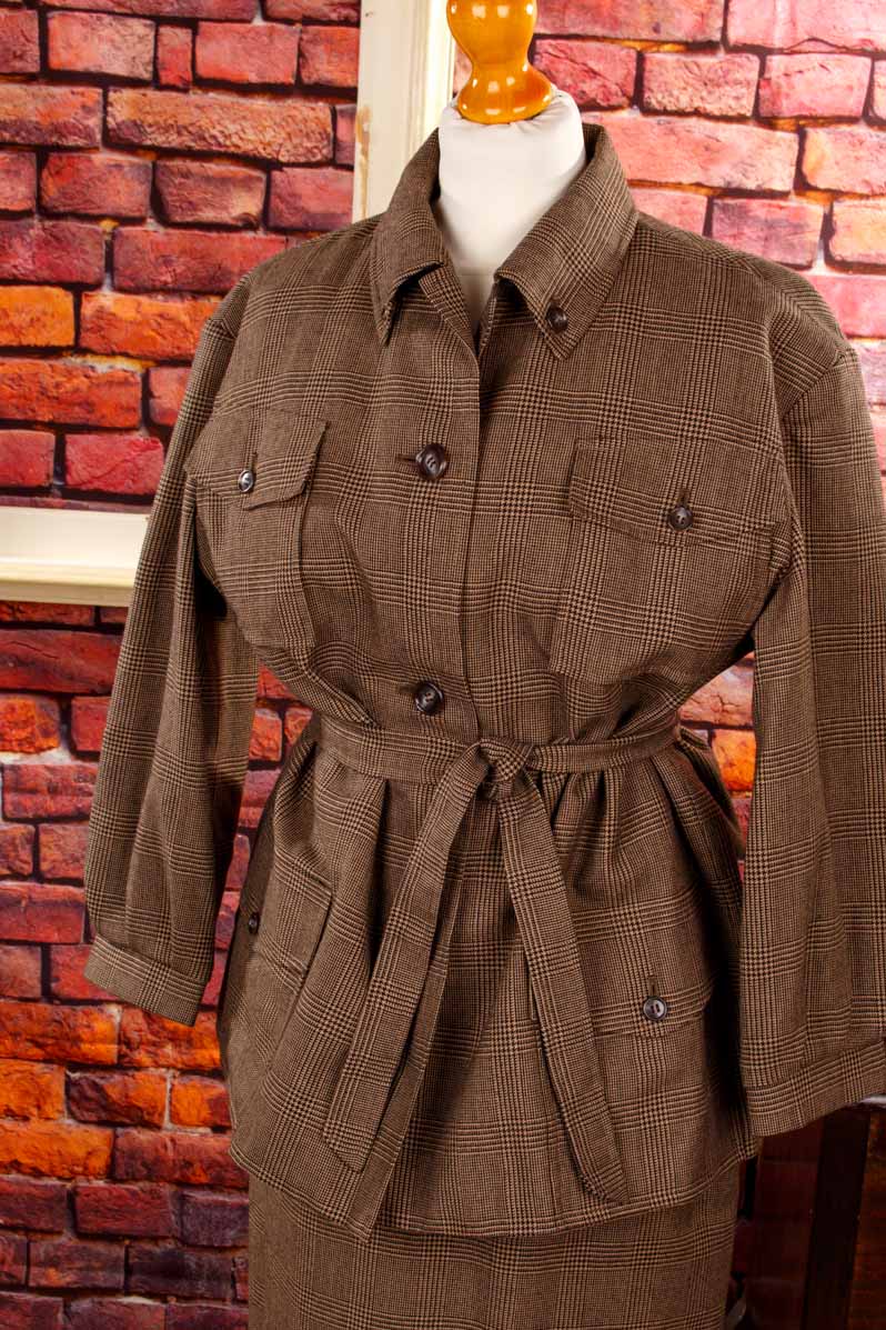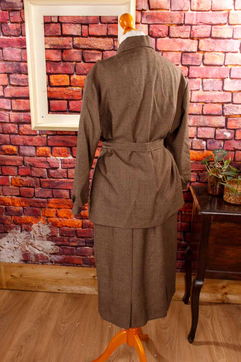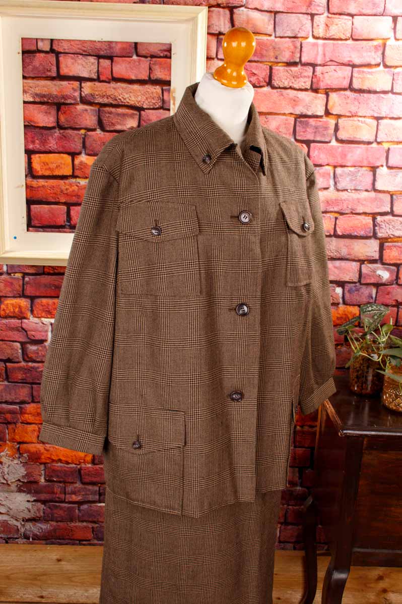 elegantes Kostüm aus schmalem Rock und weiter Jacke aus braunem Wollstoff mit Pepita-Muster