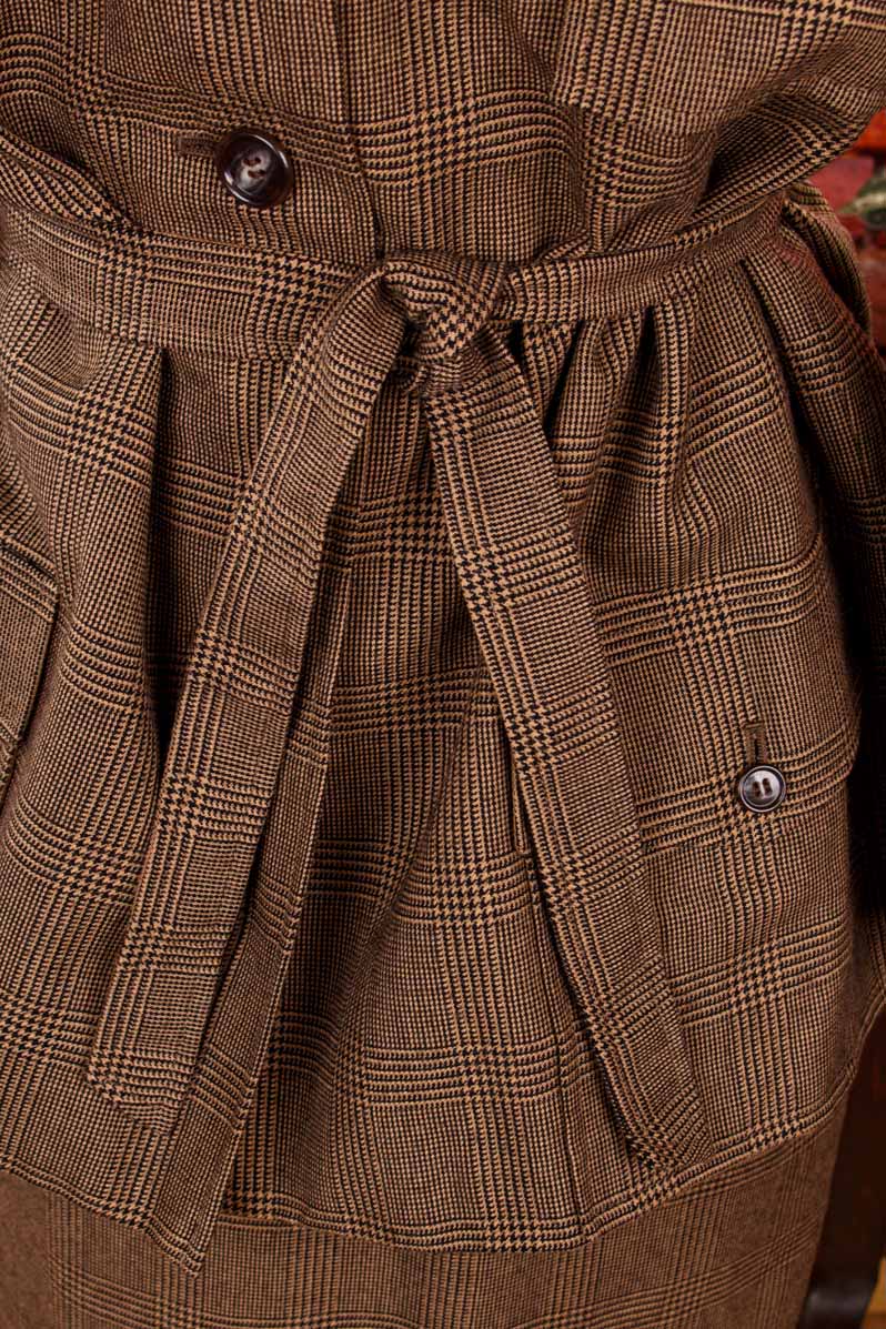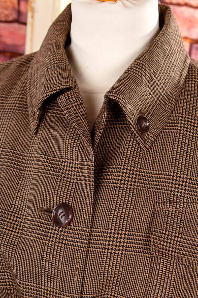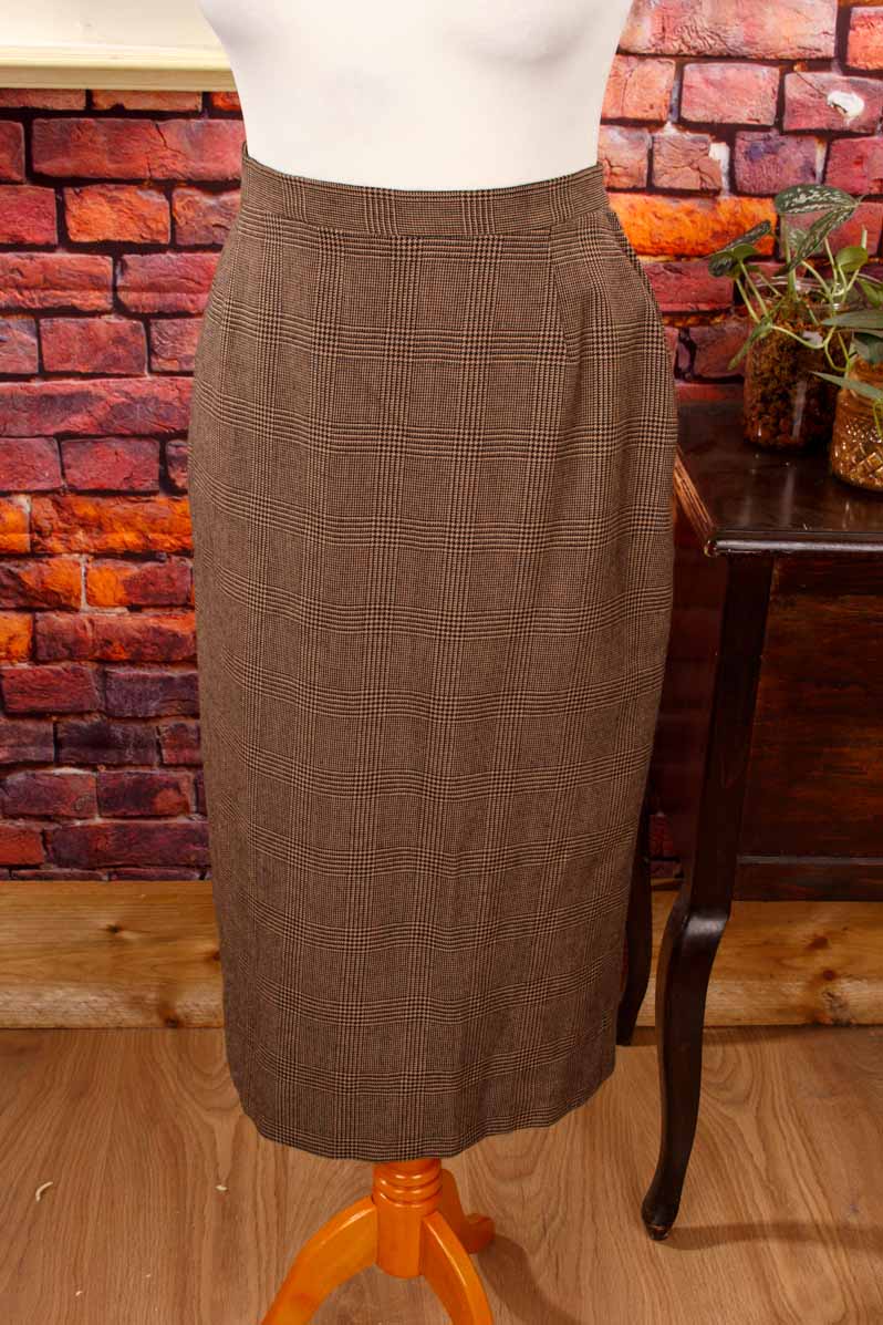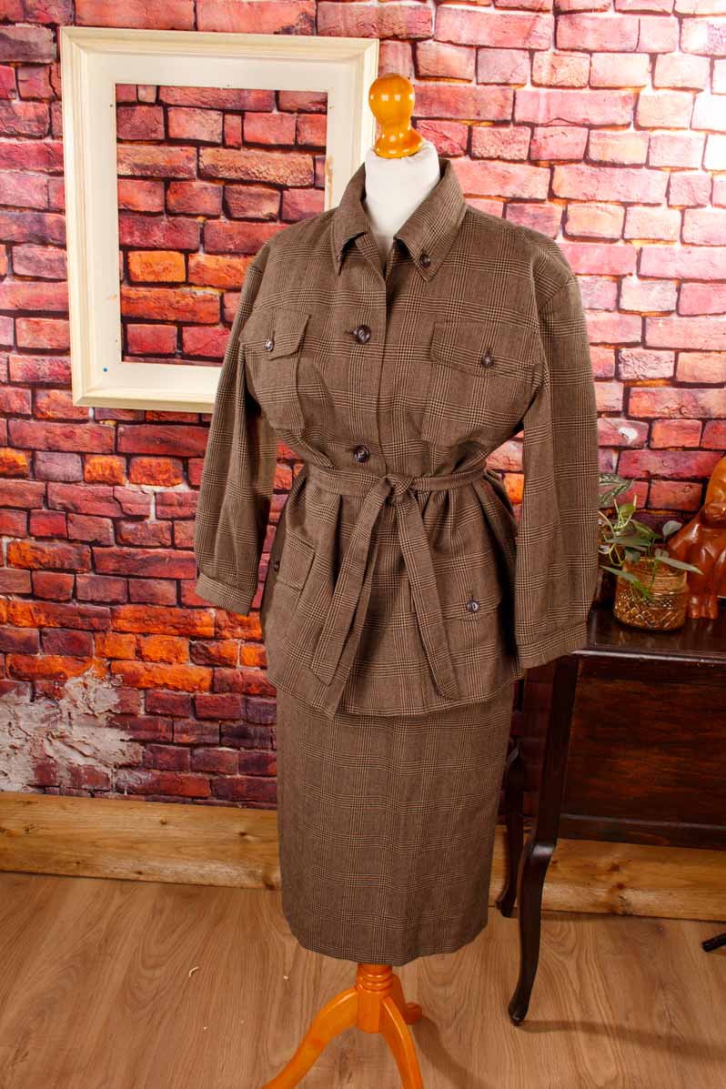 elegantes Kostüm aus schmalem Rock und weiter Jacke aus braunem Wollstoff mit Pepita-Muster