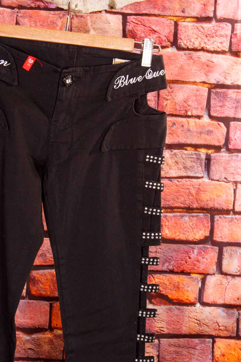 ausgefallene Hose aus schwarzem Stretch-Denim mit seitlichen Cut-Outs und Strass-Verzierung