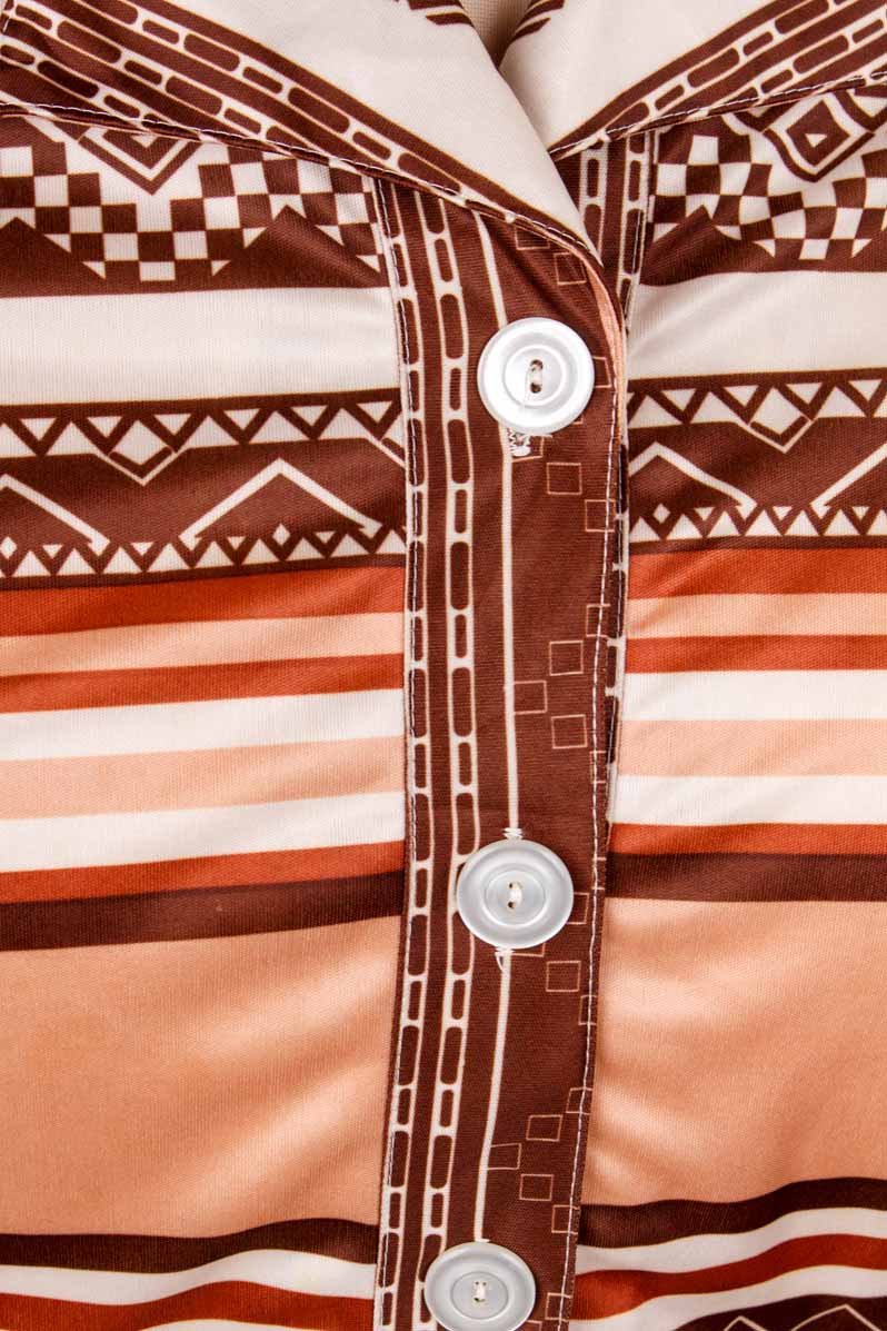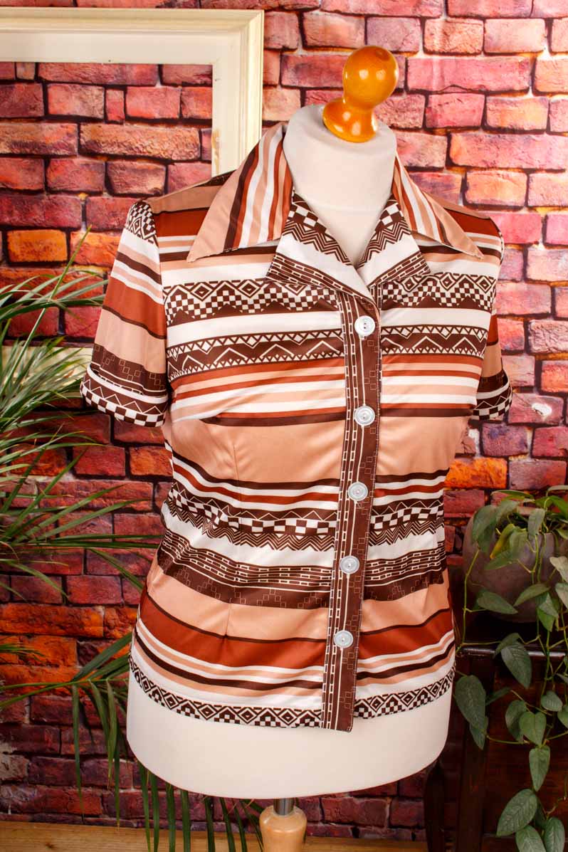 Diese beige-braun gemusterte Vintage-Stretchbluse verbindet verspielte Retro-Elemente mit modernem Tragekomfort. Der feine Stretchstoff schmückt die Bluse mit einem angenehmen Sitz, der sich leicht tailliert deiner Silhouette anpasst und dabei Bewegungsfreiheit bietet. Ein besonders großes, auffälliges Kragen-Detail zieht alle Blicke auf sich, während die klassische Knopfleiste das Design elegant abrundet. Ideal, um jedem Outfit einen Hauch von Vintage-Charme und einem Hauch von Nostalgie zu verleihen – perfekt, um spielerisch deinen individuellen Stil zu unterstreichen!Original 70er-Jahre!