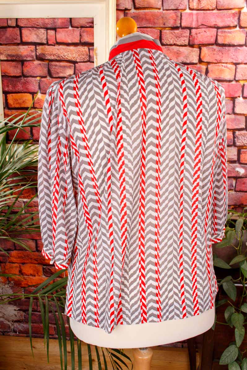 Diese zarte Vintage Bluse begeistert mit ihrem feinen grau-roten Muster, das subtil und doch auffällig zugleich ist. Der Stehkragen und die elegante Knopfleiste verleihen ihr einen charmanten Retro-Touch, während der weit geschnittene Schnitt für ein angenehmes Tragegefühl sorgt. Die halblangen Ärmel machen sie perfekt für wechselhaftes Wetter, und der leichte, leicht transparente Stoff lässt deine Haut sanft durchscheinen – ideal, um ein verspieltes, luftiges Outfit zu kreieren. Ob leger oder schick kombiniert, diese Bluse bringt sofort einen Hauch Vintage-Flair in deinen Kleiderschrank! Original 70er- oder 80er-Jahre!