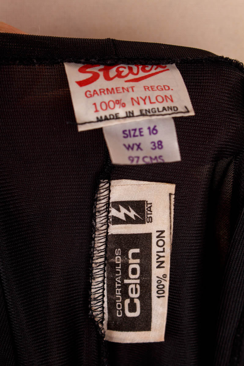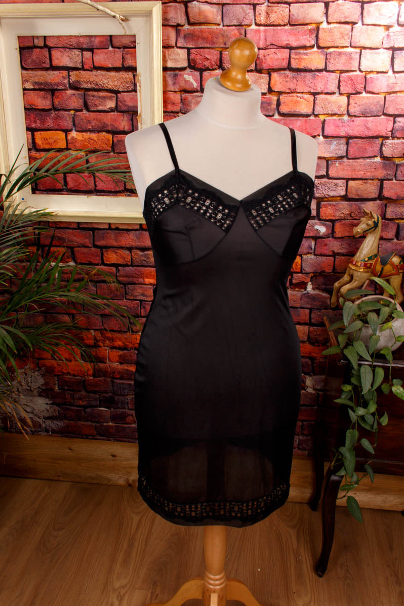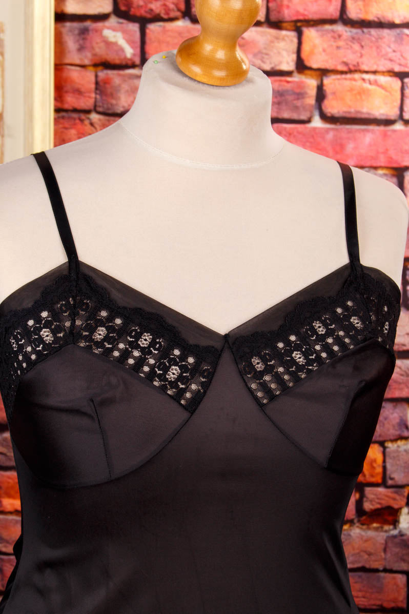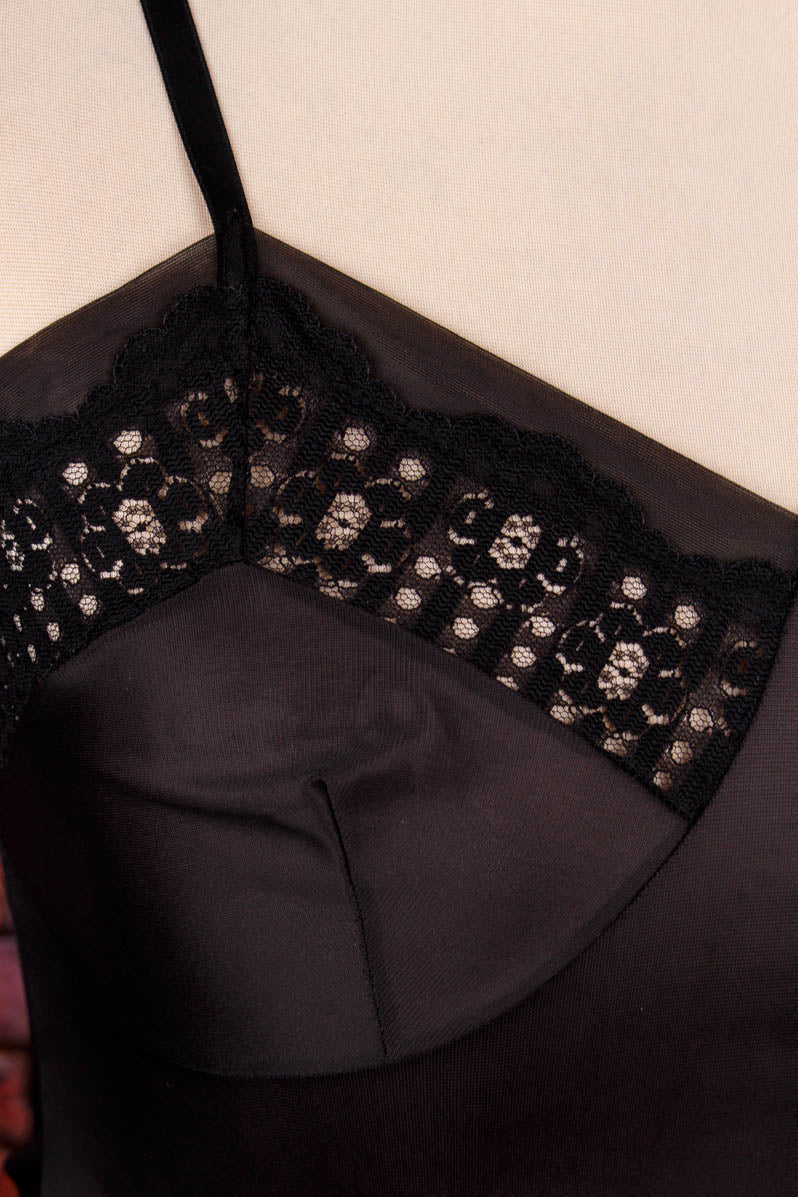schwarzes Vintage Unterkleidchen aus feinem Gewebe und zarter Spitze in aufregendem Schnitt