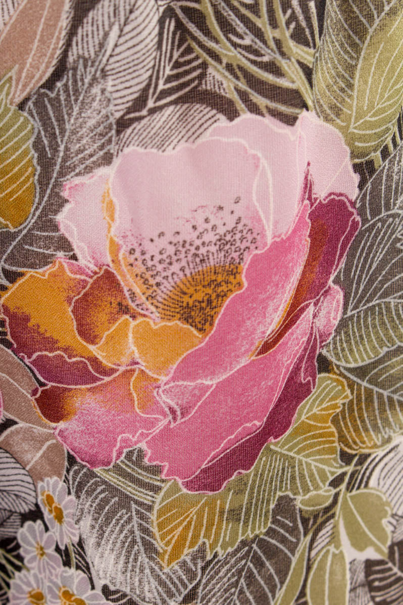 zartes Kleid aus feinem, bunt gemustertem Chiffon mit Blumenmotiv und Plissee-Falten